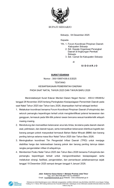 Kesiapsiagaan Menyambut Natal 2025 Dan Tahun Baru 2026Bupati Sidoarjo, H. Subandi, S.H., M.Kn, mengeluarkan Surat Edaran tentang Kesiapsiagaan Pemerintah Daerah dalam menyambut Natal 2025 dan Tahun Baru 2026.Berbagai langkah dilakukan untuk menjaga keamanan, kenyamanan, dan kelancaran masyarakat selama masa libur akhir tahun, di antaranya:Koordinasi lintas instansi (Forkopimda) untuk mengantisipasi potensi gangguan, bencana, dan kemacetan.Menjaga kelancaran arus lalu lintas dan ketersediaan kebutuhan pokok, BBM, serta bahan pangan.Mengawasi tarif dan keselamatan angkutan umum, memastikan kendaraan laik jalan dan tidak melebihi kapasitas.Menyiapkan Posko Natal dan Tahun Baru untuk koordinasi pengamanan dan pelayanan publik.Meningkatkan kesiapsiagaan bencana dan pelayanan darurat, termasuk pemadam kebakaran, kesehatan, dan call center daerah.Menjaga ketertiban umum, terutama di tempat wisata, pusat perbelanjaan, dan ruang publik.Menjamin fasilitas inklusif bagi penyandang disabilitas, lansia, ibu hamil, anak-anak, dan kelompok rentan lainnya.Pemerintah Kabupaten Sidoarjo berkomitmen memberikan pelayanan terbaik agar masyarakat dapat merayakan Natal Tahun 2025 dan Tahun Baru Tahun 2026 dengan aman, lancar, dan tertib.