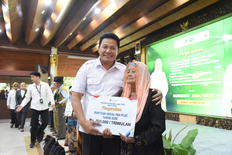 KOMINFO, Sidoarjo – Gubernur Jawa Timur Khofifah Indar Parawansa menyalurkan bantuan sosial (bansos) senilai Rp3.016.350.000 kepada ratusan penerima manfaat di Pendopo Delta Wibawa pada Selasa (17/2/2026). Bantuan tersebut sebagian besar bersumber dari Dinas Sosial Jawa Timur sebesar Rp 1.858 miliar, kontribusi dari BUMD sebesar Rp 25 juta, serta Dinas Pemberdayaan Masyarakat dan Desa (PMD) sebesar Rp 1.132 miliar. Total bantuan sebesar Rp3.016.350.000 tersebut dialokasikan untuk berbagai program perlindungan sosial, di antaranya bantuan sosial kepada lansia Program Keluarga Harapan (PKH) Plus bagi 533 keluarga, bantuan sosial penyandang disabilitas 66 jiwa, bantuan kewirausahaan inklusif dan produktif (KIP) putri jawara 100 jiwa, KIP bagi Pemerlu Pelayanan Kesejahteraan Sosial Jawa Timur Sejahtera (PPKS) Jawara 9 jiwa, bantuan permakanan Lembaga Kesejahteraan Sosial (LKS) lansia 10 jiwa, bantuan bagi pilar sosial (SDM PKH Plus, pendamping disabilitas, TKSK, dan Tagana) 77 jiwa, zakat produktif 50 penerima, serta dukungan bagi 5 BUMDesa, 2 Desa Berdaya, dan 3 Desa Jatim Puspa.Khofifah menegaskan bahwa seluruh penyaluran bansos di Jawa Timur ditargetkan rampung sebelum 1 Maret 2026 sebagai bantalan sosial dan ekonomi menjelang Ramadan.“Ini bagian dari bantalan sosial dan ekonomi. Harapannya menjelang Ramadan panjenengan semua lebih tenang, karena bantuan ini bisa dimanfaatkan untuk kebutuhan keluarga,” ujarnya.Menurutnya, program zakat produktif difokuskan bagi pelaku usaha ultra mikro agar mampu meningkatkan pendapatan dan keluar dari kemiskinan ekstrem. Sementara PKH Plus dan bantuan sosial lainnya menyasar kelompok rentan seperti lansia, penyandang disabilitas, dan perempuan kepala keluarga.Sementara itu, Bupati Sidoarjo Subandi menyampaikan apresiasi atas perhatian dan komitmen Pemerintah Provinsi Jawa Timur dalam membantu masyarakat Sidoarjo. Ia memastikan penyaluran bansos di wilayahnya akan dikawal agar tepat sasaran dan tidak terjadi pengurangan alokasi.“Penyesuaian bantuan sosial tidak ada pengurangan. Seluruhnya di-cover dan dialokasikan sesuai peruntukan. Kami pastikan distribusinya tepat sasaran dan sesuai data,” tegas Subandi.Ia menambahkan, bantuan sosial ini menjadi simbol gotong royong antara pemerintah provinsi dan kabupaten dalam menghadapi tantangan ekonomi dan sosial yang menuntut respons cepat.“Atas perintah Ibu Gubernur, Sabtu dan Minggu kemarin juga telah disalurkan bantuan kursi roda dan program bedah rumah. Hari ini bansos untuk Sidoarjo turun. Artinya, kita optimistis angka kemiskinan bisa ditekan dan ekonomi masyarakat meningkat,” ujarnya.Subandi berharap sinergi antara Pemprov Jatim dan Pemkab Sidoarjo terus diperkuat, termasuk melalui peran pilar sosial seperti TKSK, Tagana, dan pendamping PKH, agar seluruh bantuan benar-benar memberikan dampak nyata bagi kesejahteraan masyarakat. (Dew/Git)