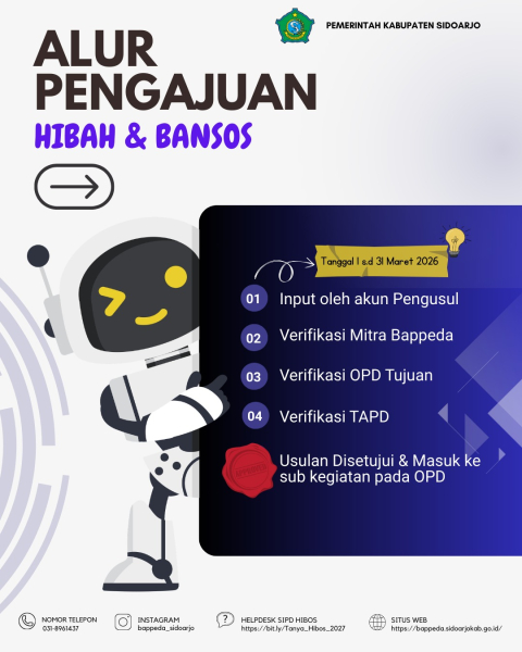 Dalam rangka penyusunan Rencana Kerja Pemerintah Daerah (RKPD) Kabupaten Sidoarjo Tahun 2027, Pemerintah Kabupaten Sidoarjo mengundang lembaga/organisasi masyarakat yang memenuhi kriteria untuk mengajukan proposal bantuan sosial/hibah Tahun 2027.Bagi yang ingin mengajukan, diharapkan segera melengkapi berkas sesuai peraturan yang berlaku. Informasi detail mengenai persyaratan dapat dilihat di Peraturan Bupati Sidoarjo Nomor 66 Tahun 2025 tentang Tata Cara Penganggaran, Pelaksanaan dan Penatausahaan, Pelaporan dan Pertanggungjawaban, serta Monitoring dan Evaluasi Hibah dan Bantuan Sosial Pemerintah Kabupaten Sidoarjo.Permohonan dilakukan secara tertulis dan melalui aplikasi SIPD pada alamat https://sipd-ri.kemendagri.go.id/ hingga tanggal 31 Maret 2026.