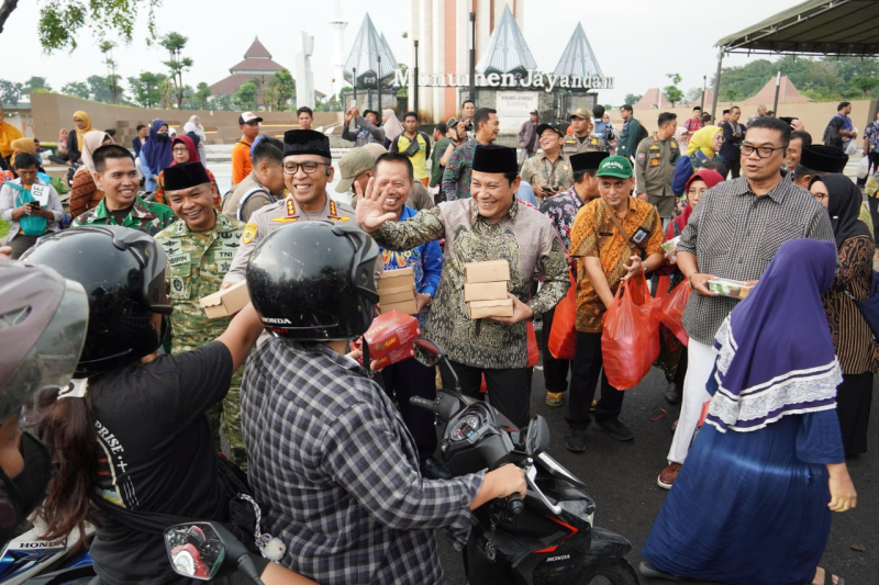 KOMINFO, Sidoarjo – Bupati Sidoarjo Subandi didampingi oleh Sekretaris Daerah Kabupaten Sidoarjo Fenny Apridawati beserta Kepala Organisasi Perangkat Daerah (OPD) dan Aparatur Sipil Negara (ASN) di lingkungan Pemerintah Kabupaten Sidoarjo, pada Kamis sore, 05/03/2026, telah mendistribusikan 75.000 paket takjil kepada pengguna jalan, meliputi pengendara kendaraan roda empat, roda dua, dan pejalan kaki, yang melintas di depan Monumen Jayandaru, Alun-Alun Sidoarjo.Takjil yang tersedia merupakan partisipasi seluruh ASN yang ada di kabupaten Sidoarjo yang bersama-sama ingin berbagi di Bulan Suci Ramadhan ini.Bupati Subandi menyampaikan jika kegiatan berbagi takjil ini merupakan wujud kepedulian seluruh ASN Kab. Sidoarjo untuk berbagi kepada masyarakat Sidoarjo. Tampak antusias pengguna jalan yang melintas didepan Monumen Jayandaru menerima pembagian takjil dan selain pengguna jalan tentunya bagi masyarakat yang sengaja ingin ngabuburit di Alun-alun juga turut menerima pembagian takjil ini.Pembagian takjil ini dilaksanakan secara serentak. Selain terpusat di Alun-alun Sidoarjo, kegiatan ini juga diselenggarakan di beberapa kecamatan di Kabupaten Sidoarjo."Bulan Ramadan merupakan momen yang tepat untuk berbagi. Kami berharap dengan semangat berbagi di bulan suci ini, pemerintahan Kabupaten Sidoarjo dapat senantiasa menciptakan lingkungan yang aman, tenteram, dan nyaman bagi seluruh masyarakat Sidoarjo."ucapnyaBupati juga menyampaikan bahwa kegiatan berbagi ini merefleksikan semangat kebersamaan dan kerukunan masyarakat Kabupaten Sidoarjo.Ia pun menyatakan, "Kegiatan ini merupakan inisiatif murni dari partisipasi seluruh Aparatur Sipil Negara di Kabupaten Sidoarjo dengan tujuan untuk berbagi bersama masyarakat Sidoarjo, sehingga Pemerintah dan masyarakat dapat bersinergi, menciptakan suasana yang kondusif, dan memastikan kelancaran roda pemerintahan demi terwujudnya pembangunan serta pelayanan yang optimal bagi masyarakat Kabupaten Sidoarjo."katanyaSemangat kebersamaan dan kepedulian di bulan Ramadan ini tidak hanya dimaknai sebagai bulan ibadah, tetapi juga sebagai momentum untuk berbagi, membangun kebersamaan, kerukunan, dan gotong royong antara Pemerintah dan masyarakat.yu