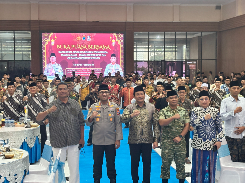 KOMINFO, Sidoarjo - Dalam meningkatkan rasa persatuan dan kebersamaan antara Polisi, TNI, Pemerintah Kabupaten Sidoarjo, dan berbagai elemen masyarakat selama bulan Ramadan, Polresta Sidoarjo menggelar kegiatan buka puasa bersama di Gedung Serbaguna Polresta Sidoarjo, Kamis (5/3/2026).Hadir dalam acara tersebut Bupati Sidoarjo H. Subandi, Kapolresta Sidoarjo Kombes. Pol. Christian Tobing, Dandim 0816 Sidoarjo Letkol Czi Shobirin Setio Utomo, jajaran Forkopimda Sidoarjo, organisasi kemahasiswaan, serta tokoh agama dan masyarakat Sidoarjo.Rangkaian kegiatan diawali dengan penyerahan santunan kepada anak yatim secara simbolis oleh Bupati Sidoarjo H. Subandi. Setelah itu, acara dilanjutkan dengan tausiyah yang disampaikan oleh Gus Rokhib.Dalam sambutannya, Subandi menyampaikan bahwa kegiatan buka puasa bersama menjadi sarana memperkuat kebersamaan. “Buka bersama ini tidak sekadar momen untuk menikmati hidangan, tetapi juga menjadi sarana untuk mempererat silaturahmi antara jajaran Forkopimda, tokoh agama, tokoh masyarakat, dan seluruh elemen yang ada di Kabupaten Sidoarjo,” ujarnya.Menurutnya, kebersamaan tersebut merupakan modal utama untuk menjaga persatuan, memperkuat rasa saling percaya, serta membangun semangat hidup rukun di tengah masyarakat. “Untuk membangun Sidoarjo tidak bisa dilakukan hanya oleh pemerintah, tetapi membutuhkan dukungan semua pihak mulai dari aparat keamanan, tokoh agama, dan tokoh masyarakat,” ungkapnya.Ia menambahkan bahwa dengan kebersamaan tersebut, berbagai tantangan dapat dihadapi bersama. “Dengan kebersamaan, kita menghadapi tantangan menjaga kondusivitas daerah serta mewujudkan pembangunan yang berkeadilan dan bermanfaat bagi seluruh Kabupaten Sidoarjo. Untuk itu, saya mengajak seluruh elemen masyarakat agar tetap menjaga persatuan, memperkuat nilai-nilai kebersamaan, dan menumbuhkan semangat gotong royong. Mari kita jadikan momentum Ramadan ini sebagai sumber kekuatan dan keberkahan agar tak henti-hentinya saling mendukung, menghormati, dan membantu,” jelasnya.Subandi juga menyampaikan pesan khusus terkait pelaksanaan Pilkades di Kabupaten Sidoarjo. “Tadi saya bersama Bapak Kapolresta Sidoarjo menitipkan satu pesan kepada seluruh yang hadir. Menjelang Pilkades, kami mengajak seluruh masyarakat dan para kiai untuk menjaga stabilitas politik yang ada di Kabupaten Sidoarjo serta menjaga keamanan di daerah Kabupaten Sidoarjo,” ujarnya.Ia juga menambahkan bahwa semua program dapat berjalan dengan baik apabila didukung oleh kolaborasi seluruh elemen masyarakat. “Semua program dapat terlaksana apabila ada kolaborasi antara pimpinan daerah, tokoh agama, dan semua elemen yang memberikan dukungan bagi Kabupaten Sidoarjo,” pungkasnya.Kegiatan kemudian ditutup dengan ramah tamah seluruh tamu undangan saat berbuka puasa di wilayah Sidoarjo dan sekitarnya. (Mar)