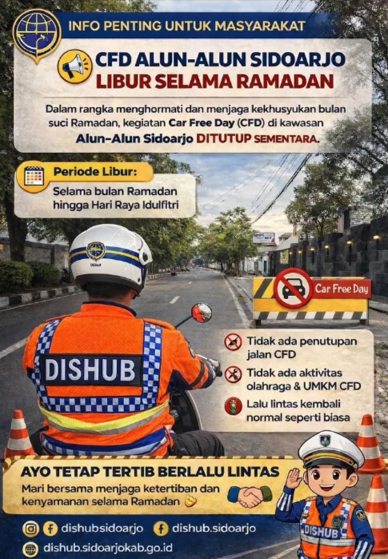 Selama bulan suci Ramadan, kegiatan Car Free Day (CFD) di kawasan Alun-Alun Sidoarjo DITIADAKAN SEMENTARA.