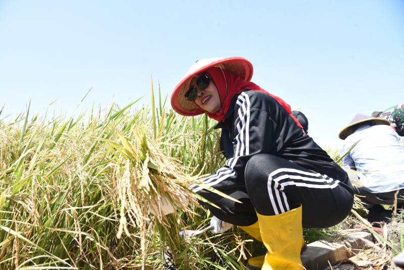 Wabup Hj. Mimik Idayana juga bersyukur atas panen padi kali ini. 12 hektar tananam padi dilahan persawahan Desa Bakung Temenggungan itu dapat tumbuh subur. Para petani juga sudah merasakan hasilnya. Sebagaian tanaman padi jenis serang yang ditanam tiga bulan lalu sudah dapat dipanen.