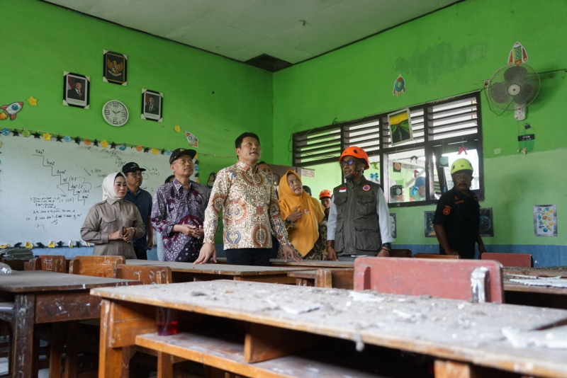 KOMINFO, Sidoarjo – Bupati Sidoarjo, H. Subandi, meninjau langsung kondisi kerusakan atap di SDN 1 Sidokepung, Kecamatan Buduran, yang ambruk akibat hujan deras beberapa waktu lalu. Peninjauan dilakukan untuk memastikan keselamatan siswa serta mencari solusi atas keterbatasan ruang kelas di sekolah tersebut, Sabtu(18/4/2026).