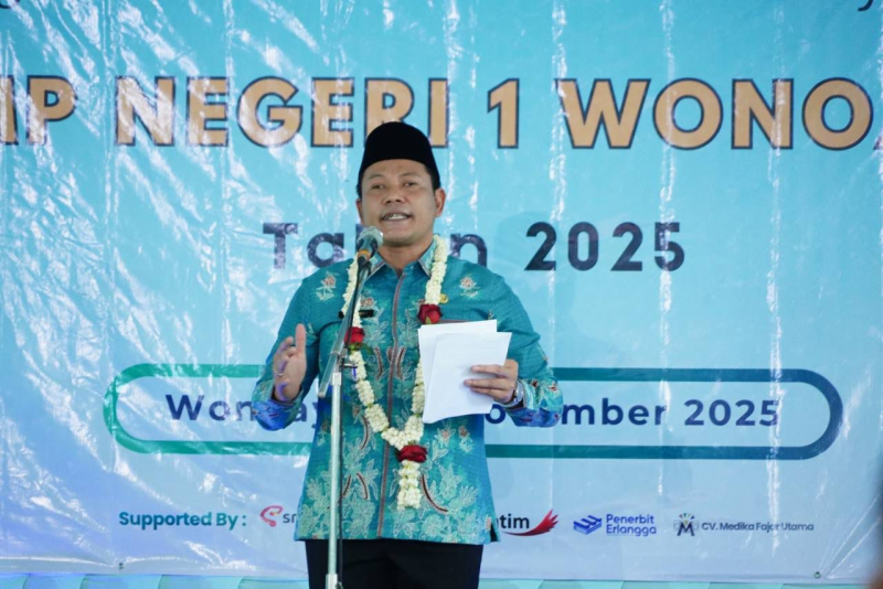 KOMINFO, Sidoarjo - Aula dan halaman SMP Negeri 1 Wonoayu dipenuhi semangat kreasi pagi tadi (20/11), ketika sekolah meluncurkan dua program literasi inovatif: BergeMPPita (Bergerak Menulis Pantun, Puisi, dan Cerita) dan Tugu Cerita (Satu Minggu Satu Cerita). Kegiatan yang mengusung tema “Merangkai Kata Menebar Makna Dalam Karya dan Aksi” dibuka secara resmi oleh Bupati Sidoarjo H. Subandi, SH., M.Kn., dalam puncak peringatan Bulan Bahasa dan Pameran Kokurikuler sekolah.Peluncuran kedua program tersebut berlangsung khidmat, dan simbolis saat Bupati Sidoarjo H. Subandi, SH., M.Kn., bersama pejabat daerah menekan sirine dan menandatangani papan peluncuran sebagai tanda komitmen bersama. Kehadiran kepala dinas, kepala sekolah, kabid mutu pendidikan, kepala perpustakaan, komite sekolah, orang tua murid, dan Forkompimka Wonoayu mempertegas dukungan multi-pihak untuk gerakan literasi ini.Usai prosesi launching, Bupati Sidoarjo bersama rombongan langsung membuka Pameran Kokurikuler secara simbolis dengan pengguntingan pita. Dilanjut dengan keliling melihat pemeran serta memberi semangat para siswa yang sedang menulis pantun, puisi dan cerita, hingga membuat Bupati Sidoarjo sangat terkesan.Bupati H.Subandi merasa sangat bangga sekali dengan karya anak-anak SMP Negeri 1 Wonoayu yang sangat kreatif dan inovatif ini. Memang seharusnya anak-anak kita diberikan kegiatan yang seperti ini. Kalau mereka melepaskan HP nya, tentu akan memiliki inovasi yang sangat tinggi.“Hari ini terlihat inovasinya sangat luar biasa, terkesan sekali, terutama gagasan-gagasannya yang telah diberikan kepada peserta didik SMP Negeri 1 Wonoayu. “Semoga kegiatan seperti ini, saya harapkan bisa diikuti oleh SMP-SMP yang lainnya,” ujar Bupati Subandi.Pendidikan yang kreatif, pendidikan yang santun sekaligus bisa mengalihkan perilaku anak-anak terhadap bullying. “Pendidikan yang santun, literasi yang luar biasa, jadi model pendidikan, dimana anak-anak kita bisa senang. Itulah yang penting, jangan berikan pendidikan yang tidak sesuai dengan keinginan atau kemampuan anak-anak,” tegasnya.Tidak hanya mendorong kreativitas, H. Subandi juga menekankan pentingnya menjadikan literasi sebagai kebiasaan sehari-hari, bukan sekadar tugas akademis.“Pembelajaran kreatif seperti ini bisa menumbuhkan mereka berinovasi, sehingga mereka nantinya akan tumbuh menjadi anak yang cerdas, yang mempu mengelola jati dirinya sendiri. Itulah harapan kami,” ungkapnya.Plt Kepala SMP Negeri 1 Wonoayu, Lilik Sulistyowati juga menuturkan kalau kegiatan ini sesuai dengan temanya, yakni semua anak-anak kelas VII, VIII dan IX telah menulis pantun, puisi dan cerita secara massal, termasuk bapak dan ibu gurunya, juga perwakilan orang tua murid yang kami undang. “Mereka kami bebaskan untuk memilih menulis apa, tujuannya adalah meningkatkan karakter anak dalam berliterasi,” tuturnyaAcara Speniwa BergeMPPita’ dan ‘Tugu Cerita’ diharapkan menjadi langkah nyata dalam upaya bersama membangun Sidoarjo yang semakin maju, berbudaya, dan berdaya saing melalui penguatan fondasi literasi generasi mudanya. Dan kedepannya bisa menjadi insiprasi sekolah lain di Sidoarjo mengadakan kegiatan yang positif ini. (Son/Mas/hmsen)