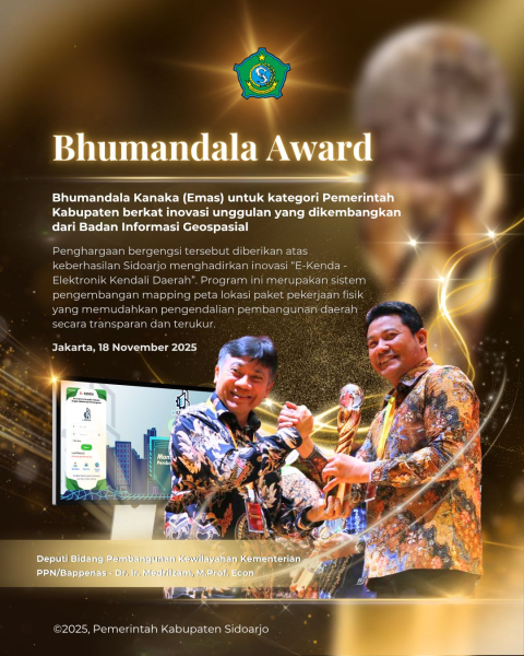 KOMINFO,Sidoarjo - Pemerintah Kabupaten Sidoarjo kembali mencatatkan prestasi di tingkat nasional. Pada Selasa, (18/11) Kabupaten Sidoarjo dianugerahi penghargaan Bhumandala Kanaka (Emas) untuk kategori Pemerintah Kabupaten atas inovasi dari Badan Informasi Geospasial.Penghargaan diserahkan langsung oleh Deputi Bidang Pembangunan Kewilayahan, Kementerian PPN/ Bappenas Dr. Ir. Medrilzam, M.Prof.Econ, Ph.D, kepada Bupati Sidoarjo, Subandi, S.H., M.Kn., di Auditorium Sukarman Lt. 2 Perpustakaan Nasional RI.Inovasi yang memenangkan penghargaan kali ini Adalah “E-Kenda ( Elektronik Kendali Daerah). E-Kenda ini sebuah sistem peta digital yang memetakan lokasi paket pekerjaan fisik sehingga pengendalian pembangunan dapat dilakukan secara transparan, terukur, dan real time. Sistem ini memungkinkan monitoring proyek secara digital, memudahkan verifikasi lapangan, dan meningkatkan akuntabilitas penggunaan anggaran pembangunan.E-Kenda diinisiasi oleh Bagian Administrasi Pembangunan Sekretariat Daerah Kabupaten Sidoarjo bekerja sama dengan Badan Informasi Geospasial. Desainnya fokus pada kemudahan pemantauan proyek fisik, integrasi data lokasi paket pekerjaan, dan antarmuka yang dapat diakses oleh pemangku kepentingan terkait untuk mengecek progres dan status pekerjaan.Bupati Subandi menyambut penghargaan itu dengan rasa syukur dan melihatnya sebagai pengakuan atas kerja kolektif. Prestasi ini mecnandakan hasil kerja keras dan kerja cerdas pemerintah daerah. "Penghargaan Bhumandala Kanaka ini bukan hanya milik pemerintah, melainkan milik seluruh masyarakat Sidoarjo. E-Kenda lahir dari kebutuhan nyata untuk memperbaiki tata kelola Pembangunan, agar setiap anggaran dapat dipertanggungjawabkan dan manfaatnya cepat dirasakan oleh warga," ujar Subandi.Ia menegaskan komitmen daerah untuk terus mendorong inovasi digital dalam pelayanan publik. "Kami akan terus mengembangkan E Kenda dan memperluas fungsinya, mulai dari monitoring fisik hingga integrasi data perencanaan dan aspirasi masyarakat. Teknologi harus hadir sebagai alat memperkuat partisipasi publik dan menegakkan transparansi." Jelasnya.Penghargaan ini, menegaskan posisi Sidoarjo sebagai daerah yang adaptif terhadap transformasi digital dalam pemerintahan. Dengan sistem pemantauan proyek yang lebih transparan, risiko keterlambatan, pembengkakan biaya, dan ketidakjelasan lokalisasi proyek dapat diminimalkan. Lebih lanjut ia berharap melalui aplikasi ini, masyarakat lebih mudah mengawasi pembangunan dan berpartisipasi dalam proses perencanaan dan evaluasi. (hmsen/mas)