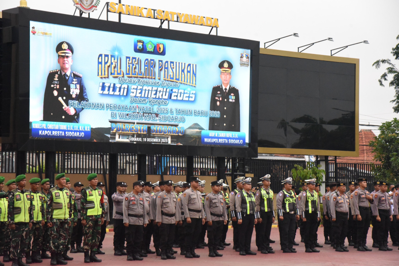 KOMINFO, Sidoarjo – Pengamanan perayaan Natal 2025 dan Tahun Baru 2026 (Nataru) di Kabupaten Sidoarjo resmi dimulai dengan digelarnya Apel Gelar Pasukan Operasi Lilin Semeru 2025 di Lapangan Apel Mapolresta Sidoarjo, Jumat (19/12/2025). Kegiatan ini turut dihadiri Kapolresta Sidoarjo Kombes Pol Christian Tobing, Dandim 0816 Sidoarjo Letkol Czi Shobirin Setio Utomo, serta unsur TNI, Polri, Satpol PP, Dinas Perhubungan, dan instansi terkait lainnya.Apel dipimpin Bupati Sidoarjo H. Subandi yang membacakan amanat Kapolri terkait pelaksanaan Operasi Lilin 2025. Ia menyampaikan bahwa Apel Gelar Pasukan merupakan bentuk kesiapsiagaan guna memastikan pelayanan dan pengamanan perayaan Natal 2025 dan Tahun Baru 2026 berjalan optimal, aman, dan kondusif. “Momentum Nataru menjadi agenda nasional yang rutin setiap tahun dan dimanfaatkan masyarakat untuk beribadah, berkumpul, serta melakukan perjalanan bersama keluarga sehingga berdampak pada meningkatnya mobilitas masyarakat,” ujarnya.Berdasarkan survei Kementerian Perhubungan RI, potensi pergerakan masyarakat pada Nataru tahun ini diperkirakan mencapai 119,5 juta orang, meningkat sekitar 7,97% dibandingkan tahun sebelumnya. Di sisi lain, informasi BMKG menunjukkan adanya tiga sistem siklonik di Indonesia yang berpotensi memicu hujan lebat, angin kencang, dan gelombang tinggi, seiring puncak musim hujan yang diprediksi berlangsung pada bulan November 2025 hingga Februari 2026. Kondisi tersebut menuntut kesiapsiagaan yang lebih tinggi dari seluruh pihak.Sebagai bentuk kesiapan, Polri bersama TNI, pemerintah daerah, dan instansi terkait menggelar Operasi Kepolisian Terpusat dengan sandi Operasi Lilin 2025 selama 14 hari, mulai 20 Desember 2025 hingga 2 Januari 2026. Operasi ini melibatkan 146.701 personel gabungan yang disiagakan di 2.930 posko, terdiri atas pos pengamanan, pos pelayanan, dan pos terpadu. Personel tersebut bertugas mengamankan gereja, pusat perbelanjaan, terminal, stasiun, pelabuhan, bandara, kawasan wisata, serta lokasi perayaan Tahun Baru. “Selain itu, rekayasa lalu lintas di jalur tol dan jalan arteri, pengamanan kawasan wisata, serta kesiapsiagaan menghadapi potensi bencana alam juga menjadi perhatian utama. Dalam pengamanan ibadah Natal, aparat turut melibatkan ormas keagamaan sebagai wujud toleransi beragama,” ucap Subandi.Sementara itu, Kapolresta Sidoarjo Kombes Pol Christian Tobing menjelaskan bahwa Operasi Lilin 2025 merupakan operasi kemanusiaan yang mengedepankan pelayanan kepada masyarakat. Ia menyampaikan bahwa Polresta Sidoarjo melibatkan sebanyak 1.671 personel yang akan disiagakan di sejumlah pos pengamanan dan pos pelayanan di seluruh wilayah Kabupaten Sidoarjo, termasuk pos utama di kawasan Bungurasih.Kombes Pol Christian Tobing juga mengapresiasi dukungan seluruh pihak yang terlibat. “Kami mengucapkan terima kasih kepada Bupati Sidoarjo, Dandim 0816, serta seluruh stakeholder atas kolaborasi dan sinergi yang telah terjalin dengan baik. Kami memastikan kesiapan personel, sarana prasarana, serta kelengkapan pendukung agar pengamanan Natal dan Tahun Baru dapat berjalan aman, lancar, dan kondusif,” pungkasnya. (Mar)