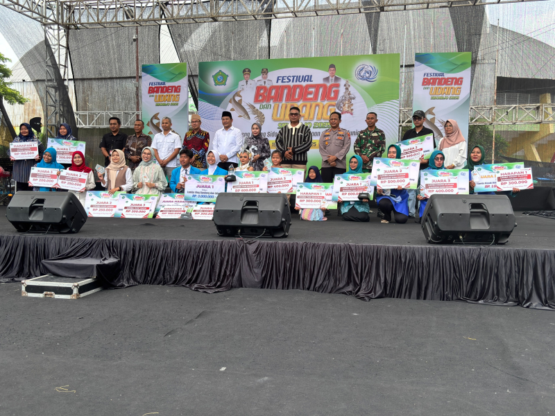 KOMINFO, Sidoarjo – Bupati Sidoarjo, H. Subandi, secara resmi menutup Festival Bandeng dan Udang Sidoarjo 2025 yang mengusung tema “Bandeng dan Udang Sidoarjo 2025, Kebanggaan yang Mendunia” di Lapangan GOR Delta Sidoarjo, Sabtu (20/12/2025). Festival yang digelar oleh Dinas Perikanan Kabupaten Sidoarjo tersebut berlangsung selama dua hari, sejak 19 hingga 20 Desember 2025.Penutupan festival berlangsung meriah dengan penampilan Tari Bandeng Nener yang dibawakan oleh siswi SDN Pucang II Sidoarjo. Tarian tersebut merupakan juara pertama lomba tari Bandeng dan Udang dalam rangka Festival Bandeng dan Udang Sidoarjo 2025.Dalam sambutannya, Subandi menyampaikan apresiasi setinggi-tingginya kepada Dinas Perikanan Kabupaten Sidoarjo, seluruh panitia, serta pihak terkait yang telah bekerja keras menyukseskan festival tersebut. “Festival Bandeng dan Udang ini menjadi momentum penting untuk memperkuat posisi Kabupaten Sidoarjo sebagai daerah penghasil komoditas perikanan unggulan, khususnya bandeng dan udang,” tuturnya.Ia menambahkan, melalui berbagai kegiatan seperti lomba memasak olahan bandeng dan udang serta bazar UMKM perikanan, diharapkan muncul kreativitas baru dan peningkatan kualitas produk lokal agar mampu bersaing di pasar yang lebih luas. Pemkab Sidoarjo, lanjutnya, berkomitmen terus mendukung pelaku usaha perikanan melalui pembinaan, fasilitasi, serta penguatan akses pemasaran.“Sinergi antara pemerintah, pelaku usaha, dan masyarakat menjadi kunci untuk mewujudkan sektor perikanan yang maju, mandiri, dan berkelanjutan. Mari jadikan festival ini sebagai ruang kebersamaan untuk saling belajar, mendukung, dan tumbuh bersama, Kegiatan seperti ini sangat penting untuk menggerakkan perekonomian petani tambak. Ke depan, pelaksanaan festival bisa ditutup pada malam hari agar UMKM memiliki waktu lebih maksimal melayani masyarakat” ujarnya.Pada kesempatan tersebut, Subandi juga menyoroti peran perbankan dalam mendukung UMKM perikanan. Ia menyampaikan bahwa Pemkab Sidoarjo memiliki program Kredit Usaha Rakyat Daerah (Kurda) dengan bunga ringan, yakni 0,2% melalui Bank Delta Artha dan KUR 6% melalui Bank Jatim. “Saya titipkan UMKM Sidoarjo kepada Bank Jatim dan Bank Delta Artha agar petani tambak bisa berkoordinasi dan mendapatkan dukungan permodalan yang optimal. Pemerintah akan terus hadir memberikan pelayanan terbaik,” katanya.Subandi juga mengingatkan pentingnya menjaga kelestarian tambak di wilayah Sidoarjo yang rawan terdampak rob, terutama saat musim hujan. “Jangan sampai petani tambak mengalami gagal panen akibat kondisi lingkungan. Kita harus bersama-sama menjaga keberlanjutan sektor perikanan agar petani tetap untung dan ekonomi daerah terus tumbuh,” ucapnya.Subandi berharap Festival Bandeng dan Udang tidak hanya digelar sekali, tetapi dapat dilaksanakan secara berkelanjutan guna mendorong pertumbuhan UMKM perikanan di Kabupaten Sidoarjo. Ia bahkan mengusulkan agar ke depan kegiatan lelang bandeng, seperti yang pernah dilaksanakan pada tahun-tahun sebelumnya, dapat kembali digelar untuk meningkatkan kesejahteraan petani tambak.Adapun pemenang Lomba Memasak Olahan Bandeng dan Udang adalah:* Juara I: Kecamatan Taman* Juara II: Kecamatan Tarik* Juara III: Kecamatan Waru* Juara Harapan I: Kecamatan Balongbendo (Mar/Dew)